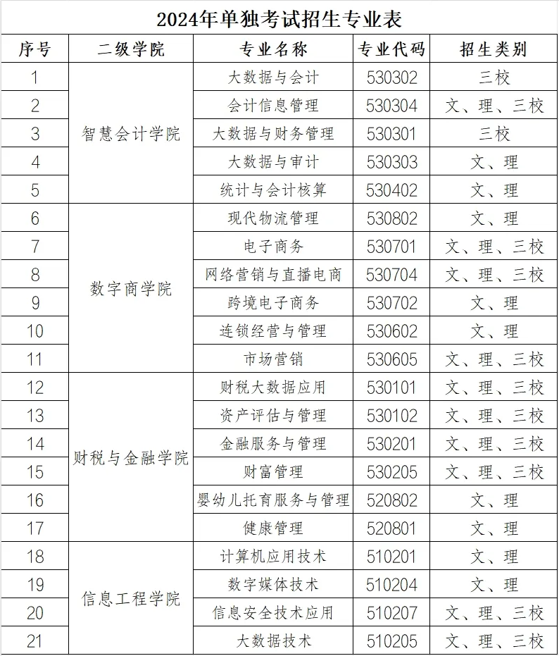 2024年云南财经职业职业学院共有21个单招专业,其中12个专业面向三校生招生,详情如下。